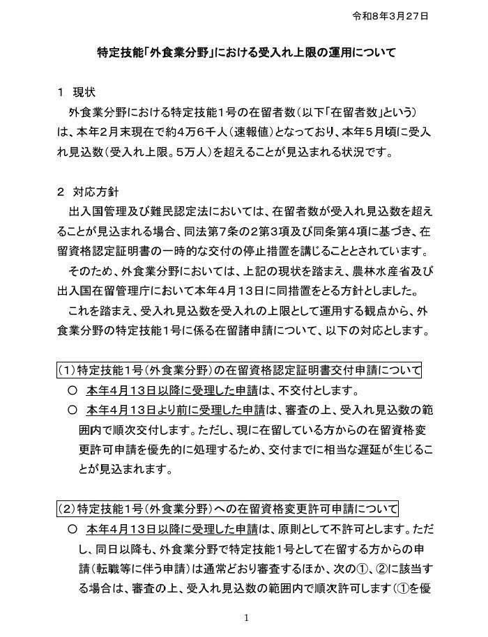 Hình ảnh thông báo chính thức về việc áp dụng giới hạn tiếp nhận trong ngành nhà hàng của chương trình Kỹ năng đặc định từ cơ quan quản lý của Chính phủ Nhật Bản